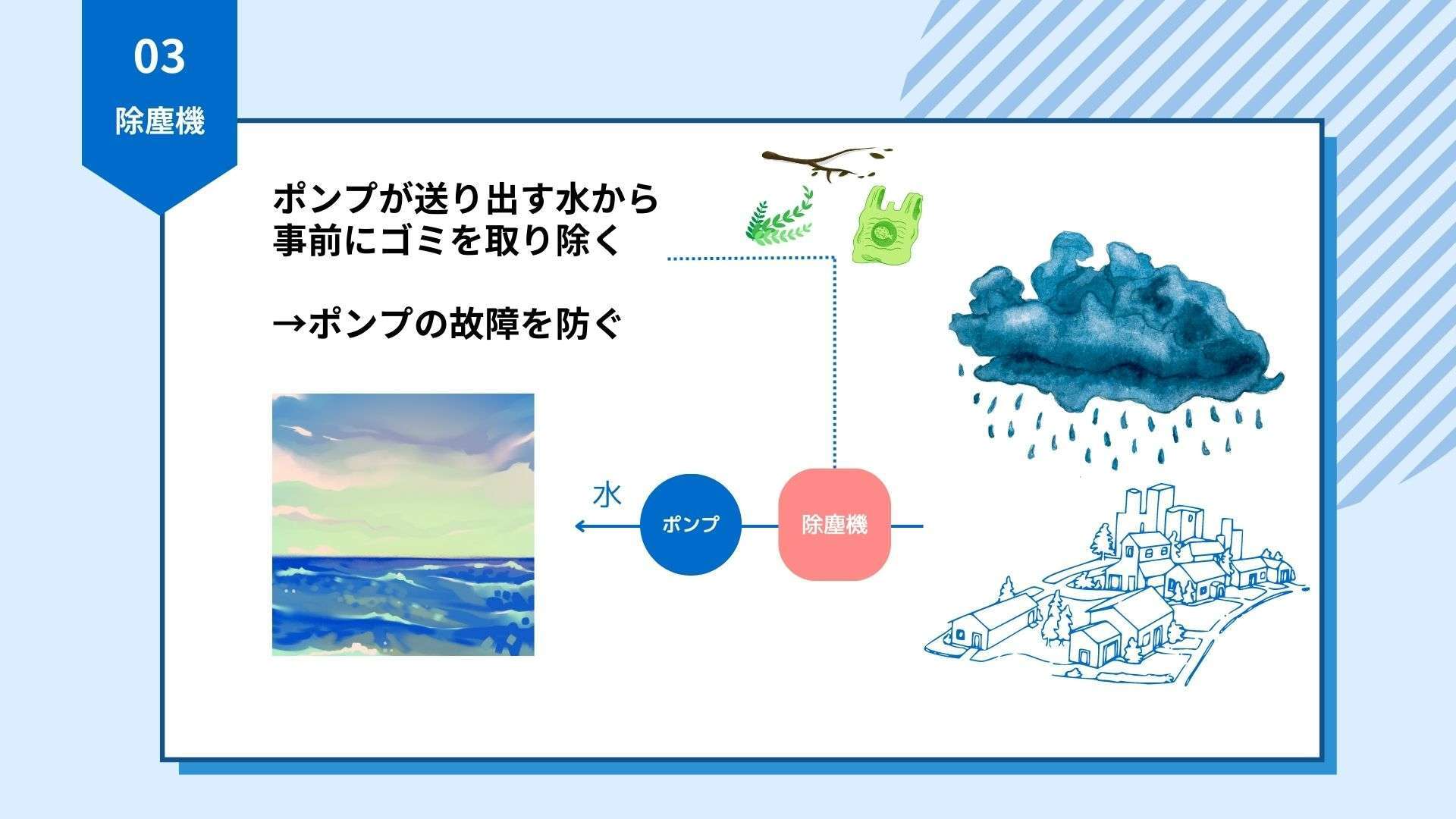 こんな時、ポンプは市街にたまった水を強制的に海へと送り出す(排水する)役割を担います。