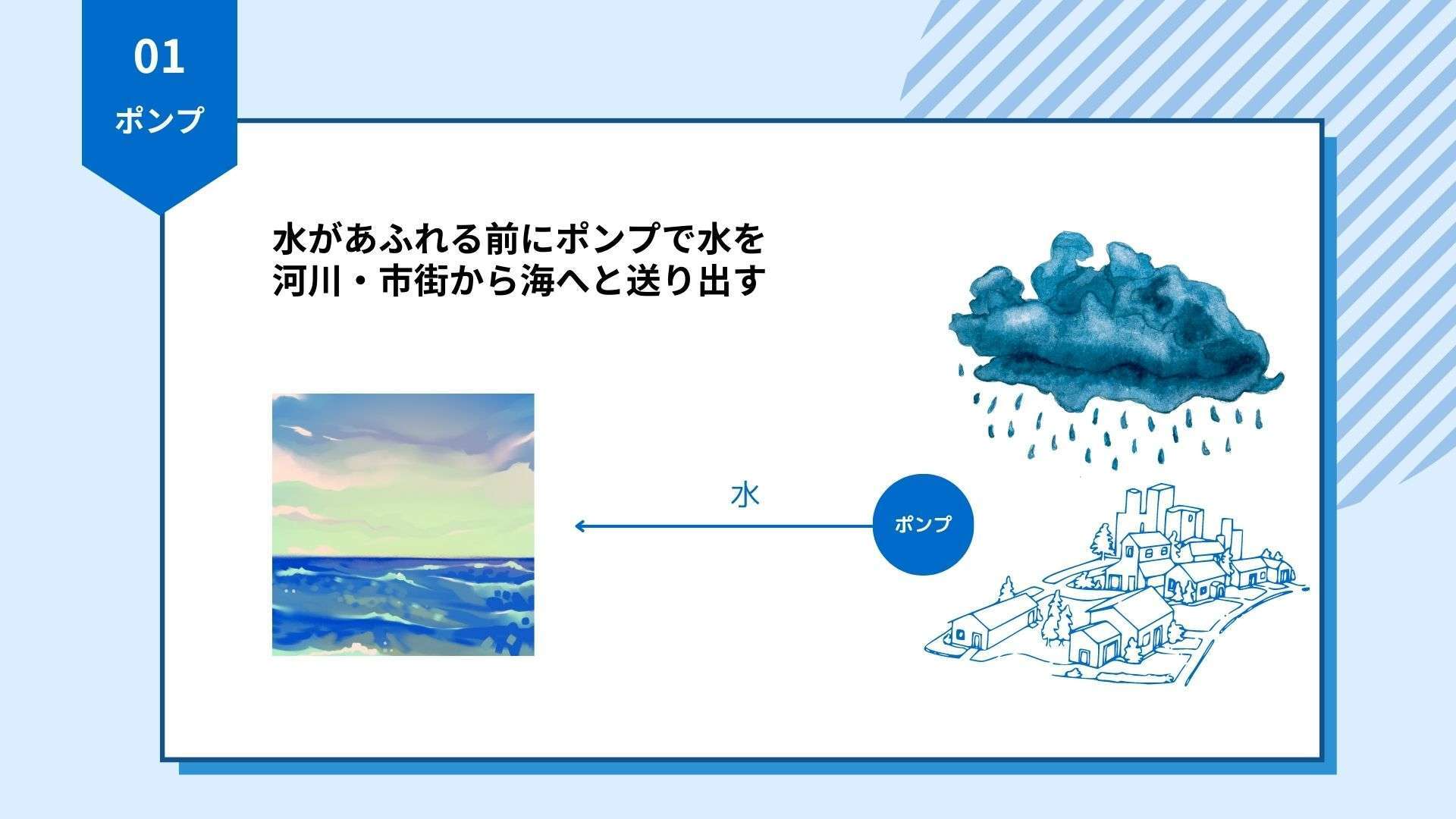 つまり、市街に水があふれる前にポンプで水を「河川・市街→海」へと水を送ることで被害を防いでいるのです。