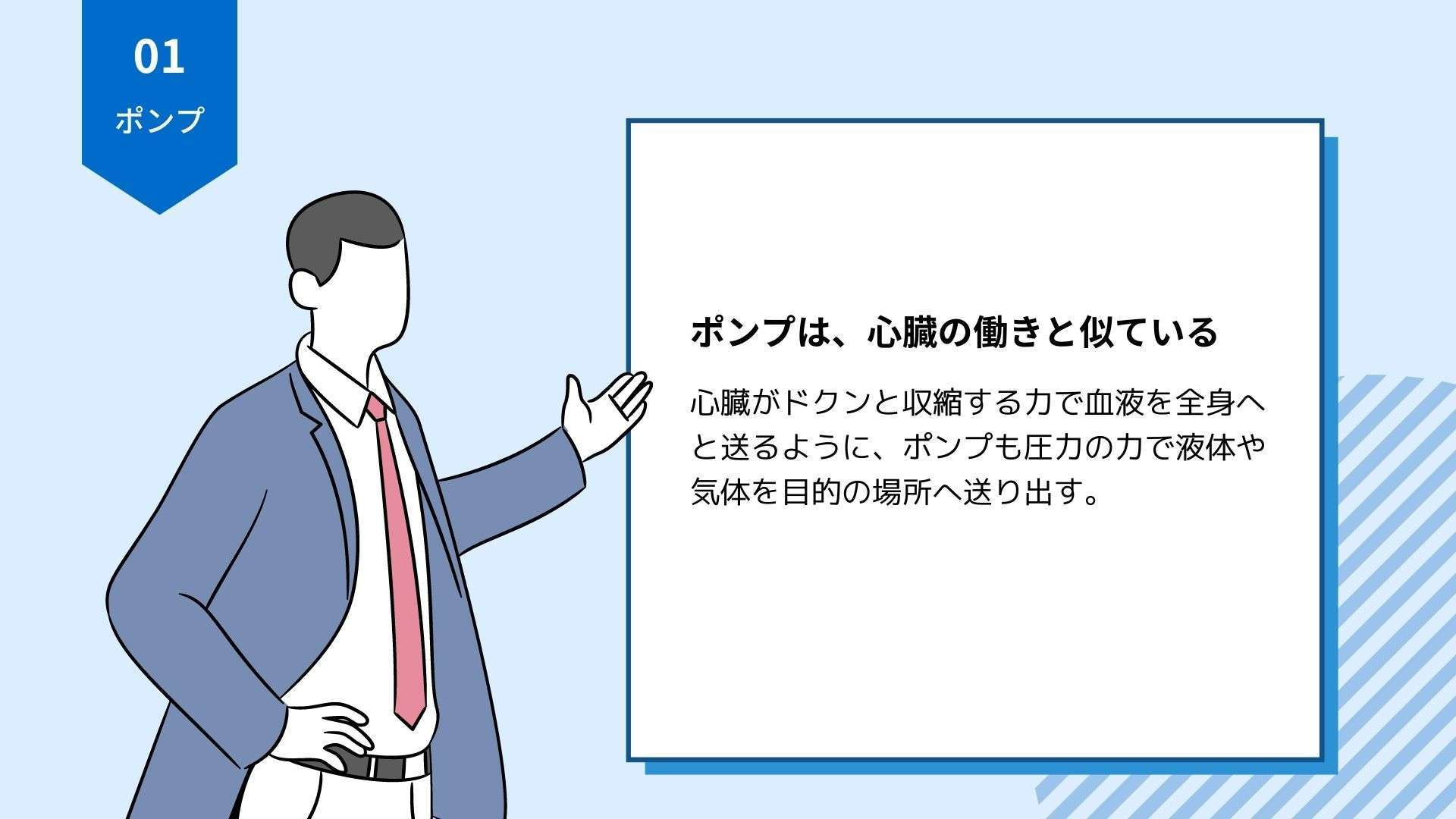 ポンプとは、液体(水・油など)や気体(ガス)をある場所から目的の場所へ送る機械のことで、目的に応じて「揚水機」や「排水機」と呼ばれます。実は、人間の心臓の働きもポンプと似ていて、心臓がドクンと収縮する力で血液を全身へと送り出しています。