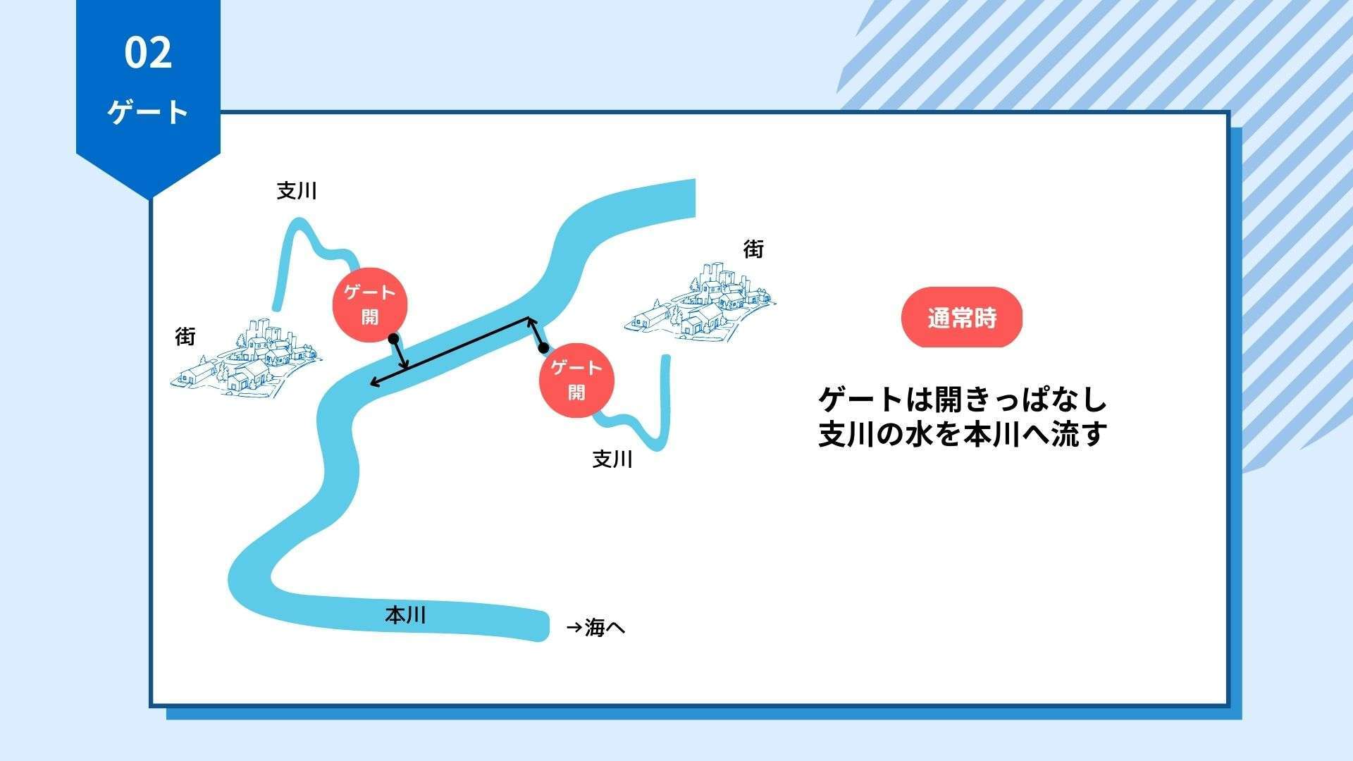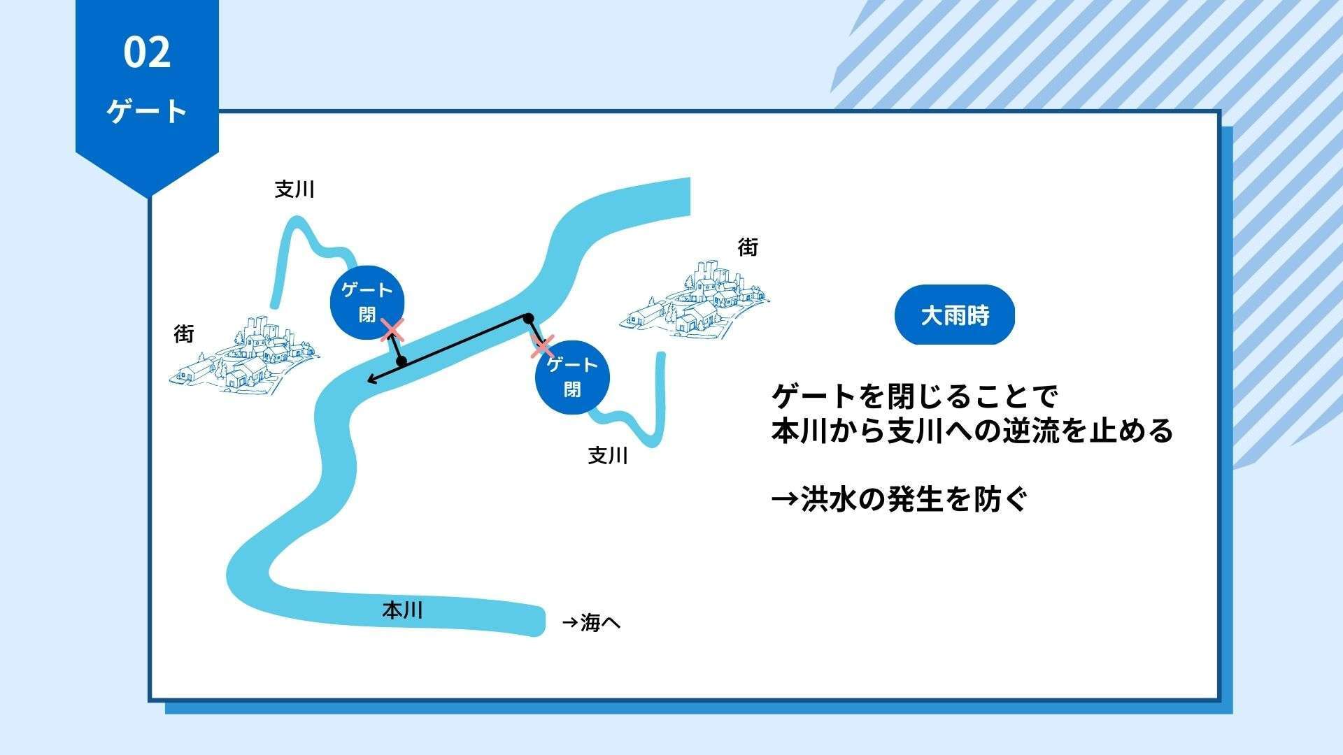 ゲートは、本川から支川への水の逆流を防ぐ役割を担います。「大きな河川から枝分かれする比較的小さな河川への逆流を防ぐ」と考えるとより分かりやすいかもしれません。