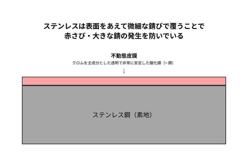 この“サビ”は私たちがよく見る赤茶色のサビ(鉄の酸化)ではなく、クロムを主成分とした「不動態皮膜」という超薄い保護膜です。