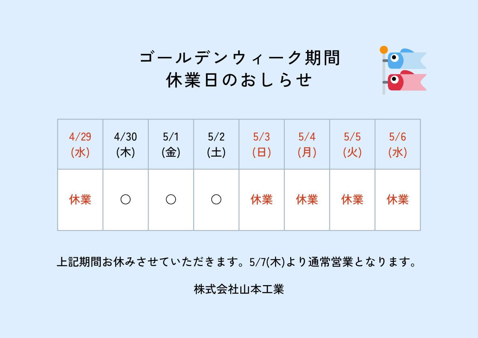 誠に勝手ながら、弊社では下記日程をGW休業とさせていただきます。