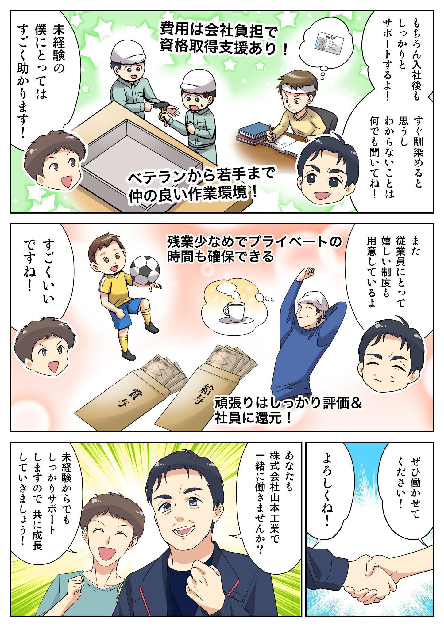 入社したらまずは資格取得を目指していただきます。仕事に関しては、先輩社員の工事をサポートしつつ、現場ではどのような流れで業務を行っているのか覚えていきます。